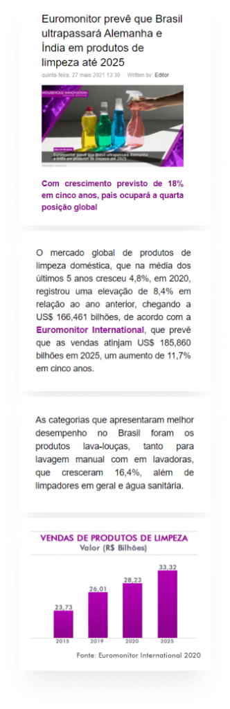 O Brasil é considerado um dos 6 maiores mercados do mundo no segmento de produtos de limpeza. Isso é devido às necessidades básicas de todos os consumidores, afinal assim como as pessoas precisam comprar alimentos para se manterem, elas também precisam comprar produtos essenciais para uma limpeza completa.